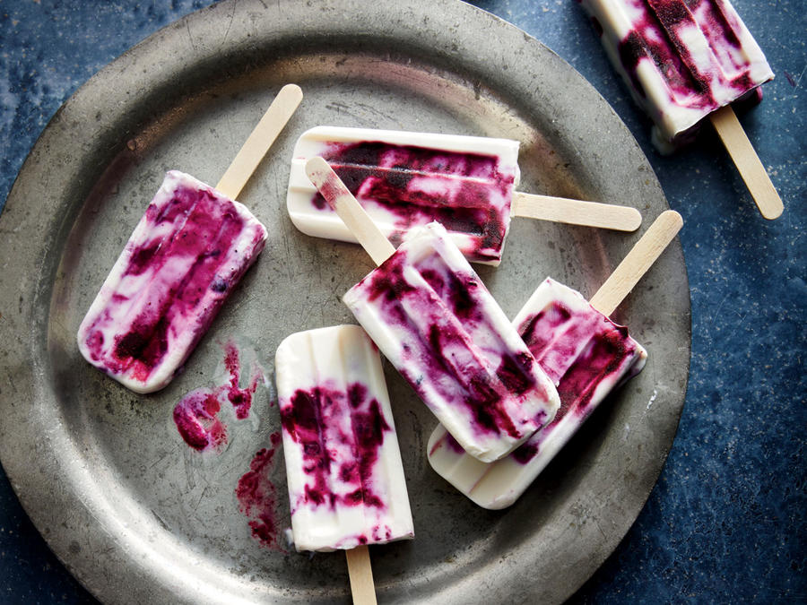 - Stir together lavender syrup and yogurt in a bowl. Spoon yogurt mixture and blueberry mixture alternately into 10 (3-ounce) ice-pop molds, beginning and ending with yogurt mixture. Swirl gently. Freeze until solid, 4 hours or overnight.